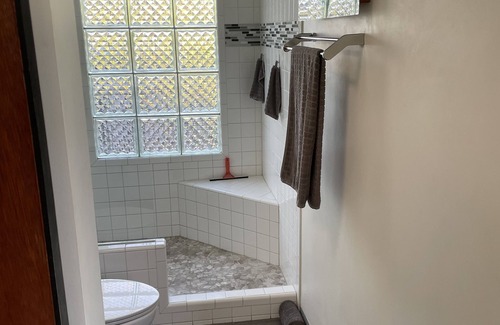 this charming guesthouse is adjacent to the host's home with it's own separate entry patio and parking It offers all the comforts of home including a full kitchenette, washer/dryer, modern walk-in shower, patio with grill, cable tv, wifi, queen bed, linens, hair dryer and iron.