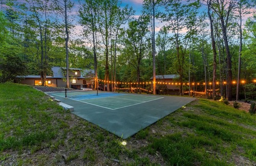 🏞️ The Pickleball Retreat 🎾 is nestled in the picturesque landscape 10 minutes from Helen, GA, where nature meets play. This stunning getaway features five spacious bedrooms and a wraparound deck. Each room has large sliding windows that provide access to the deck. Enjoy a private pickleball court, a hot tub, and several game rooms, all set on 4 acres of private forestland with your own creek access!.