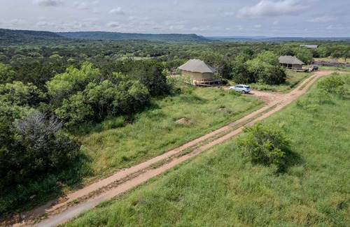 our geo dome sits on a beautiful and spacious deck overlooking the hill country Lounge outside and enjoy a coffee or evening beverage, and take in the stunning views. Or relax on the playful hammock, built directly into the platform. In the evenings, Edison string lights create a relaxed ambiance. Inside, find the comforts of a hotel room inside the safari tent. Plunge into a peaceful night’s sleep in the cozy king-sized bed with comfy bedding and linens. An additional air mattress is available for extra guests. The living space also includes a sitting area and the conveniences of a counter-height refrigerator (with freezer shelf), microwave, and coffeemaker. A standing telescope and tripod provide an opportunity to explore the endless night sky, free of light pollution far away from the city. Color-changing interior mood lighting can be controlled via remote. Your attached, personal bathroom includes a marble-top double sink vanity, toilet, and a private clawfoot tub and attached shower. Enjoy the plush set of towels. Since we have developed a carefully placed water and septic system in an intimate and remote retreat, we ask that our guests help us preserve the environment by moderating use of water.