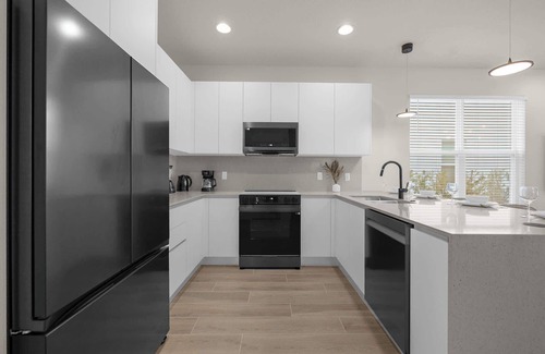 located in clermont, florida, in the tranquility townhomes community, this modern townhouse features 4 bedrooms and 3 full bathrooms Perfect for families, it's large enough to host up to 8 guests at at time. You'll love the group-friendly open-concept living space, and the fully equipped chef's kitchen. There's a large family dining table to enjoy your meals around, and also a covered poolside sitting area that's perfect for a pre-dinner drink. The back patio sundeck has recliners for you to soak up that Florida sunshine, and there's a private swimming pool ready for when you want to cool off.
