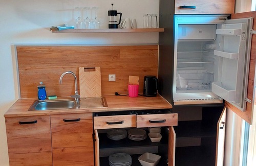 as you settle into this 2-bedroom, 1-bathroom rental, you'll find a living room and a dining area Bathroom amenities include a hair dryer, towels, and toilet paper. The kitchen is equipped with an oven, a stovetop, and a refrigerator, as well as a coffee maker, an electric kettle, and cookware. Other amenities include bed sheets and heating.