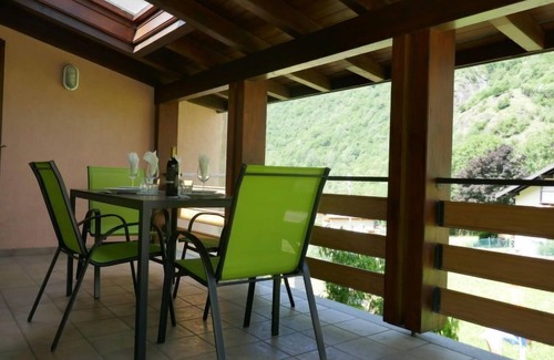 "terry", 4-room apartment 90 m2 on 1st floor Spacious and bright, practical and comfortable furnishings: open living room with satellite TV. Exit to the balcony. 1 double bedroom with 1 double bed (1 x 160 cm, length 200 cm), shower/WC. 1 room with 2 beds (90 cm, length 200 cm). 1 room with 1 bed (90 cm, length 200 cm). Kitchen (4 ceramic glass hob hotplates, toaster, kettle, freezer, electric coffee machine, Capsules for coffee machine (Nespresso) extra, raclette grill). Exit to the terrace. Bath/WC. Electric heating. Terrace. Terrace furniture, barbecue (portable), deck chairs (2). Beautiful view of the mountains and the countryside. Facilities: children's high chair, baby cot for up to 2 year olds (extra), hair dryer. Internet (WiFi, free). Please note: non-smokers only. Maximum 1 pet/ dog allowed. nl-00006981