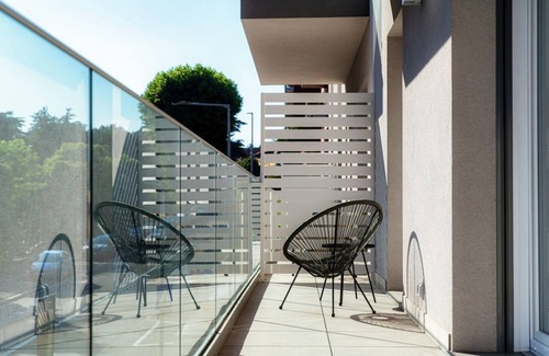 the flat has a balcony furnished with a small table and a deckchair, ideal for relaxing in the fresh air