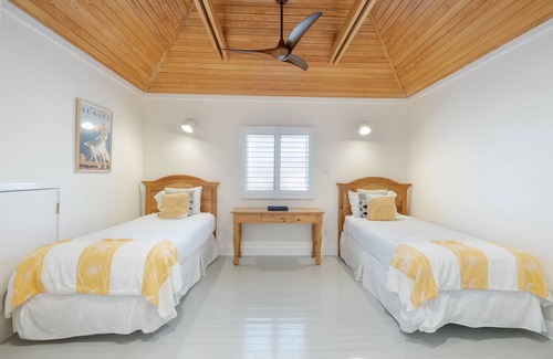 half a flight up is another owner suite presenting a queen bed and dual-sink full bath Both of these spotlight custom ceilings with lighted cupolas for added ambiance. Ten steps up from the second suite is Varuna's top floor and a circular deck that dazzles with spectacular ocean perspectives. It's one of the best spots to savor Bald Head's glorious sunsets. There are also two additional bedrooms on this level with two Twins each, a full bath and a central gathering area featuring a snug couch and TV as well as more games, puzzles and children's books.