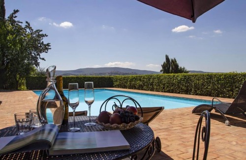 The house we propose, located in a panoramic position, is divided into two apartments communicating with each other from the outside. Large, child friendly, comfortable country house "Vedi Torre", from the 18th century, renovated in 2004, surrounded by trees and fields. 14 km from the centre of San Gimignano, 35 km from the centre of Siena, 48 km from the centre of Firenze, in the district Casaglia, in a secluded, quiet, sunny position on top of a hill, in the countryside. Private: property 1'200 m2, park 150 m2, garden 200 m2, swimming pool (12 x 6 m, depth 140 - 200 cm, seasonal availability: 27.Apr. - 26.Oct.). Outdoor shower, garden furniture, barbecue, pool maintenance by the owner/gardener. In the house: central heating system, heating to be paid on the spot, heating available only from 01.Nov. - 15.Apr.. Motor access to the house (2 km via unmade road). Parking on the premises. Supermarket 3 km, restaurant 3.5 km, bus stop 3 km, railway station 4 km. Golf course (9 hole) 10 km. Nearby attractions: Colle Val d'Elsa 12 km, Castellina in Chianti 21 km, San Donato in Poggio 23 km, Monteriggioni 26 km, Volterra 37 km, Radda in Chianti 40 km. Please note: motorway 5 km from the property. Main road 2 km from the property.