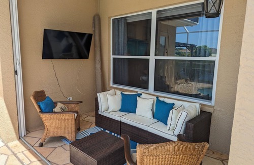 gorgeous 4br, 25 bath home. Private Pool (with heater) and large lanai enclosed by screened cage. Peaceful and quiet neighborhood, located less than 4 miles from Caspersen Beach, The Shark Tooth Capital of the World. Shopping and dining nearby, as well as quaint, historic downtown Venice just 10 minutes away. Brand new furnishings, plenty of space. Meditteranean-style suite with king bed, spacious shower and elegant soaking tub. Walk-out to linai and pool area..
