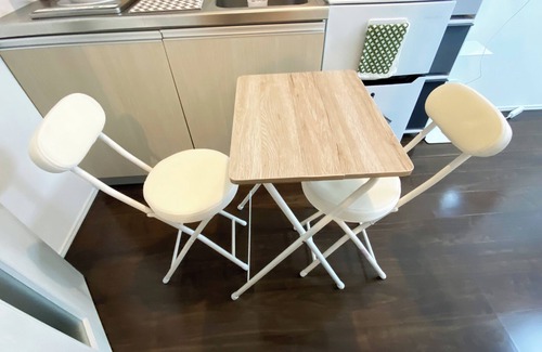 the foldable table can be used for meals or desk work The kitchen is equipped with cooking utensils needed for preparing meals.