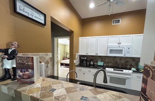 our turnkey villa has everything you need to enjoy your home-away-from-home Master Bedroom has a King-bed with on suite bathroom with a separate huge shower and a jetted tub. Guest bedroom has a queen bed and bathroom with a shower/tub combination next to the bedroom. We have a den / office with access to the pool which can be used as a third bedroom with a sleeper couch perfect if you're working remotely or just want a quiet place to read or do Zoom/FaceTime with clients or family. The large lanai overlooking the pool is surrounded by a huge yard with a lot of vegetation for additional privacy with a tropical feel. 2-car garage offers extra space bikes, kayaks, small boat etc that you may bring with you.