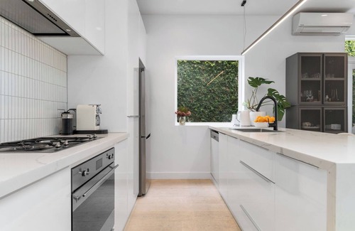 continue down the hall with its original victorian features and skylight that opens to the stunning living and dining room, headlined by a stylish stone kitchen with smeg cooking appliances and a franke dishwasher All the needed appliances are provided and a well-stocked pantry for the chef’s convenience.