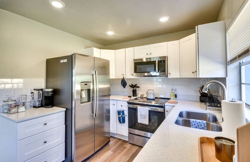 Modern comfort meets cozy digs at this modern DeLand vacation rental. Nestled north of Orlando, this single-story house features 3 bedrooms, 2 bedrooms, a well-stocked kitchen, 2 Smart TVs, a desk, and a private, fenced backyard. Hikers can explore the trails of Hontoon Island State Park, performing art enthusiasts can catch a show at the Athens Theatre, beach bums can spend the day on the sand of Daytona Beach, and nostalgia-seekers can experience the magic of Walt Disney World Resort.