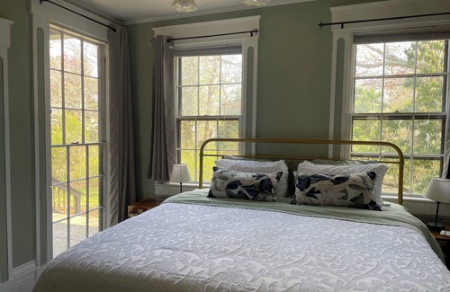 The Marble Suite brings tranquility and light. Just half a mile to the beach! With its inviting shade of green alongside the original marble fire, enjoy a glass of wine while sitting in your cozy corner looking out at the historic 200 year old beech trees cradling the room. King size bed with brand new memory foam mattress, night side tables, and plentiful storage. Full size private en suite bathroom with shower/tub. Wifi and smart tv, usb lamps for extra charging stations. Coffee/tea bar provided, ice maker, mini fridge, and microwave in the upstairs common area. Plentiful outdoor dining on the wraparound porch and grounds.