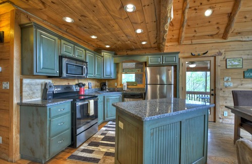the fully equipped kitchen is perfect for preparing all and any meals during your retreat The dining area is adjacent to the kitchen for ultimate convenience. Enjoying mealtime is an enjoyable experience at the gorgeous farmhouse table. The open floor plan means that family time easier than ever. The living room is spacious and offers a Mountain View out of the soaring prow front windows. The real log fireplace is perfect for a nice crackling fire while you cozy up on the couch and watch a movie with your honey.