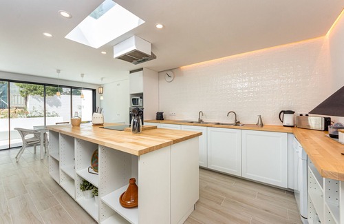entering the main villa, the new white fitted kitchen is spacious and features a large centre island with an electric hob and and automatic extractor hood /fan There are also an electric oven, microwave, dishwasher, fridge freezer, toaster, kettle, electric juicer, 3 types of coffee machines and an electric hand whisk. There are ample pots, pans, crockery, and cutlery for preparing meals. The laundry area houses a combination washing machine with dryer and iron/ironing board. There is a door accessing the the pool area, outdoor dining area and BBQ.