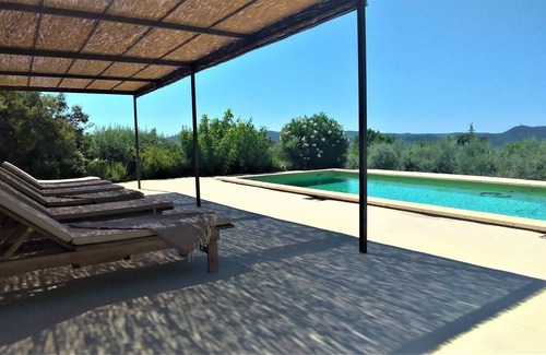 South Luberon, dominant position with panoramic view of the Durance valley: view from the wooded side of the Sainte Victoire to the Luberon and the Alpilles. Villa full comfort, full south, calm. 5000m2 enclosed garden in hill between pines and olive trees, automatic gate. Very nice traditional heated pool 12m x 4m, depth 1m50, 120m2 tanning beach with 6 teak sunbaths. The castle site and the village are within walking distance..