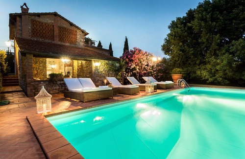 Potted plants and cypres still shade VILLA CLARA from view at this former 18th Century Small Mansion gone glam in the Tuscan countryside. Lush gardens frame a sparkling pool at this restored farmhouse near Lucca, in a village known for its Camellias festival and bespoke Extra Virgin Olive Oil. Beamed ceilings, brick floors, and archways retain the original ambiance, and a dining loggia shows off the views through a parish at the top oft he hill. Cut into local produce in the bright kitchen, relax and play chess in the stone-built pool house -once a horse stable- opening onto the patio by your private swimming pool. Horseback riding, tennis, and golf are all within range.Grey-toned fabrics, and crystal chandeliers that fill this open-concept home frames big windows revealing rolling hills around the villa say country estate, but the city center of Lucca is only 12 kilometers away.Listen to the bird’s chirping as you stretch out on a lounger by the saltwater pool, play on the lawn, or steal away to the shade of the covered outdoor living area. Savor the complimentary fresh fruit and bottle of wine around the alfresco dining table for 10 before heating up the barbecue for dinner with sunset views.Stone walls and a tiled roof still give the impression of a period villa, but inside, the home shows off its style in color, texture, and artwork. INTERIORS:On the GROUND FLOOR: 3 double bedrooms, 3 bathrooms with 3 built in showers, and a living room with TV and french windows overlooking the garden.On THE MAIN FLOOR: an indoor fully equipped kitchen, a spacious dining room to seat 12 guests, another living room with TV and a french windows overlooking the garden, 2 bedrooms (1 of which with 2 twin beds) and 1 bathroom with a built in shower.Air conditioning is provided in each single room, a very reliable wifi connection provided by the national phone company it is provided, sat tv and private parking inside the property. The Villa is located within a walking distance from restaurant and shops.Included in the rental price:Final CleaningTowels and linensElectricityGasWaterInternet WifiHigh chair (upon request at booking)Babycot (upon request at booking)Not included in the rental price:Tourist tax: mandatory and required by the local municipality, where applicable.Midstay and/or weekly cleaning and change of towels and linensBaby cot's linens.