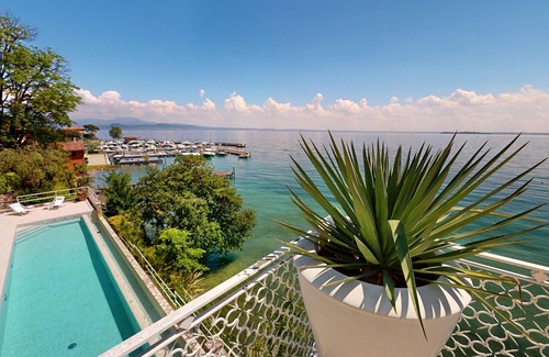 Prestigious villa on Lake Manerba del Garda with pool, private beach and stunning lake view.In the splendid setting of Manerba del Garda, just above the port of Dusano, Villa Flora stands. Entering, you find yourself in a bright living room, from which you can enjoy a complete lake view. The large French windows, the light colours of the finishes and furnishings and the orientation of the house further enhance the shades of blue and green that the sky and the lake offer to the guests of this residence. The living room is divided into a lounge area and a reading area, from which you access the dining area and the open-plan kitchen, all with a lake view from every point. Accessing the sleeping area, on the left side you find the main bathroom and a wardrobe, the only rooms without a view, and a double bedroom with a balcony, on the right side of the corridor instead we find a double room and the master bedroom with private bathroom and walk-in wardrobe. The property is equipped with screensThe south-east side of the house is entirely served by a large terrace from which you can dominate the lake and from which you can also enjoy the view of the pool and the port behind.On the basement floor there is a loggia where you can comfortably park several cars.The pearl of this house is the pool, with an overflow waterfall on the lake, long and narrow for swimming and enjoying the view.The villa has a large garage where you can park four cars. From the garage you can go up to the ground floor or access the laundry room and the technical rooms.Also in the basement, with access from the garage, there are two other rooms: a home spa with a Turkish bath, shower and relaxation area and a study or double bedroom, also with a lake view.The villa with its modern and attractive exterior is surrounded by a well-kept garden, with a gazebo and seating to relax and rich in paths that lead down to the lake, up to some inaccessible beaches to others.The house has air conditioning throughout the accommodation, wi-fi, alarm and private garage.If not directly charged in the booking, the tourist tax (per guest) and a security deposit of €500 will be required upon arrivalCIN IT017102B4SI68VC4V.