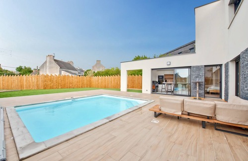 Welcome to Plouguerneau in this brand new villa designed for comfortable holidays. You will enjoy a large garden with a heated swimming pool, a fully equipped large terrace, jacuzzi and private petanque court, as well as a second terrace on the upper floor offering a superb sea view. The beach is located just 800 metres away and the town with its shops is 2 km away. Fully equipped, the house can comfortably accommodate up to 9 travellers.*The swimming pool is open and heated from 14/04 to 31/10, the jacuzzi is accessible all year round.The accommodation has 4 bedrooms:- On the ground floor: two bedrooms with a Queen Size bed (160x190 cm) and direct access to the terrace, as well as a third bedroom with two single beds (90x190cm) and a trundle bed.- Upstairs: a large master suite with a King Size bed (180x200 cm) and en-suite bathroom (shower and hairdryer).The large living area is located on the first floor. It features a modern and fully equipped kitchen (refrigerator, freezer, oven, microwave, dishwasher, induction hobs) offering you everything you need to cook as if at home. For your breakfasts, a kettle, a toaster, and a Nespresso coffee machine are at your disposal. You can share your meals around the dining table that seats 9 people, or enjoy the one on the terrace in summer. A bar corner with stools completes the room. In the evening, gather in the living room, comfortably seated on the sofas facing the television.Two other bathrooms are also at your disposal: one with a shower and toilet, the other, located next to the jacuzzi, with a shower. The accommodation also has 3 independent toilets.Near the pool is a covered outdoor kitchen, equipped with an oven, microwave, dishwasher, coffee machine, hob, gas barbecue and refrigerator.A washing machine, a baby cot and a high chair are provided.You will be able to park up to 5 vehicles in the courtyard and store your bicycles safely in the garage.Ideally located close to the beach, this rental is located at:250 m from the restaurant "Le Lizen", 800 m from Bassinic beach 800 m from Koréjou beach 1 km from the restaurant "Le carré saint michel", 2 km from the Nautical Club of Plouguerneau 2 km from the supermarket "Carrefour Contact Plouguerneau", 2 km from the supermarket "Intermarché de Plouguerneau", 19 km from the theme park "La récré des 3 curés", 25 km from Brest Bretagne Airport 29 km from the city of Brest 29 km from La Cavale Blanche Hospital in Brest 30 km from Océanopolis 33 km from the Pen Ar Bed Golf Domain 35 km from Brest train stationPlouguerneau, located in Finistère, offers you an ideal setting for a family holiday. Between fine sandy beaches, marine landscapes and remarkable natural sites, you will find everything you need here to enjoy the sea and nature. Do not miss the Wrac'h Island Lighthouse, a must-see spot for a seaside walk. For sports enthusiasts, numerous water activities await you on the beaches.This accommodation benefits from a concierge service with a team available throughout the stay for personalised services.This holiday let does not have Wi-Fi connection.This furnished accommodation is not suitable for people with reduced mobility.Animals are not allowed in this rental.The accommodation tax will be added to the rental amount and must be paid in advance of your stay.REF : hoomy12542.