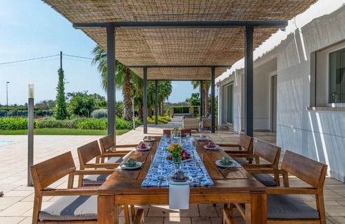 villa i chiani is a modern villa, immersed in the countryside near gagliano del capo, a few minutes from the beaches of santa maria di leuca and marina di pescoluse Built in the 80s and now completely energy efficient, the villa combines traditional materials with a modern and minimalist design. Arranged entirely on one level, it houses four bedrooms and three bathrooms, a living area with dining room and kitchen that opens onto a shaded veranda. The garden, surrounded by palm trees and Mediterranean vegetation, is equipped for outdoor living, with a barbecue area, wood oven, swimming pool and petanque court. Located in the lower Salento, the villa is perfectly positioned for exploring both the Adriatic and Ionian coasts.