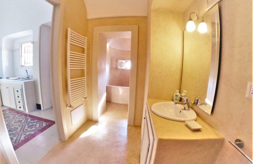 The elegant Villa Liberty is located in the center a few meters from the suggestive historic center of Ruffano, an ancient city village located in the territory of the "Serre del Salento" (a plateau extension of the "Murge di Puglia" made up of hills) and positioned in the center -south of the Salento peninsula, equidistant (about 15-20 km) from the most exclusive beaches of the Ionian Sea (Torre San Giovanni, Maldive del Salento, Gallipoli etc.) and from the rocky bays of the Adriatic Sea (Marina Serra di Tricase, Marina di Castro and Marittima, Marina di Novaglie, Santa Maria di Leuca, etc.). The architecture of the Villa is typical of late 19th century noble villas, as is the structure of the garden characterized by stone porticoes. Today, the kitchen is located in the large "Palmento", the wine cellar, that is the place where in ancient times the grapes were pressed to produce wine, equipped with ancient stone tanks, which can still be admired today preserved by large glass plates . In the rear garden of the Villa, the attention is immediately drawn to the elegant swimming pool, equipped with every comfort and surrounded by an enchanting and verdant garden of fruit trees, flowers and Mediterranean plants. The Villa extends over a mezzanine level for about 300 square meters; the large entrance characterized by the high ceiling built with the typical star vaults, gives access to a large central living room and to the first two double bedrooms, each with a bathroom, one of the two bedrooms also has a small adjoining kitchen and access to the rear terrace with table and sitting area. The living room has a relaxation area with sofas and TV, tables for reading and for working. You then enter the other two double bedrooms, each with en suite bathroom and direct access to the garden facing the pool; All the rooms are decorated with a pleasant mix of modern and antique style, spacious and offer the possibility of adding an extra bed, they are air-conditioned and served by four private bathrooms, two of which have typical stone tubs. The whole Villa is rented for exclusive use.