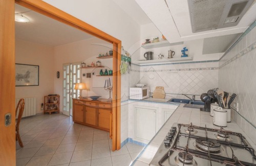 covered property of 160 square meters immersed in the greenery of a luxuriant garden, with wooden fence and closed by an automatic gate with external opening, all arranged on one floor The living area consists of a large entrance porch equipped for eating and a very comfortable outdoor kitchen with a wood-burning oven. Inside, a large and bright living room with sofas, fireplace, dining room and large separate kitchen. The sleeping area consists of three comfortable bedrooms, two of which are doubles and one quadruple (2nd single bed can be pulled out). At guests' disposal also 3 comfortable bathrooms, one with a bathtub and two with a shower.