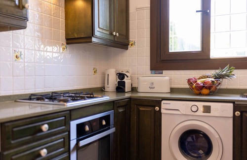 the u- shaped kitchen is well equipped and complete with all the modern appliances you need - including fridge/freezer, microwave, coffee machine and more From the window of the kitchen you can look out to the pool area. There is also an indoor dining area inside the house.