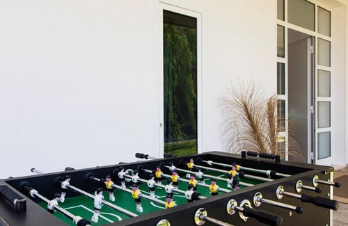 the outdoor area is incredibly spacious, with plenty of grass space for kids to run around There’s also a large private pool, so kids can swim till their fingers and toes prune. Around the pool, guests can relax on sun loungers topping up their tan and taking a dip when they need to cool down. There’s also an outdoor dining area under cover, as well as an outdoor living area.