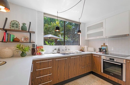 discover this lush retreat where mid-century charm meets contemporary comfort, enriched by local soul The open-plan living area invites you to unwind on the olive-green sofa, framed by tropical views, while a smart TV with Netflix offers effortless entertainment. Indigenous art and thoughtful styling add warmth and character throughout.