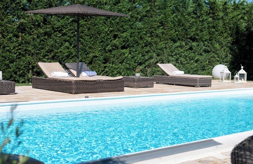 villa rudy is surrounded by a private garden of approximately 2000 sqm, with typical plants such as holm oaks, cork oaks, olive trees, laurel, and flowers From the private, covered parking area, shaded by two centuries-old oaks, you can access the pool area, which is surrounded by a well-maintained lawn. The external lighting, automatic, fully customizable, and adaptable by the guests, including RGB LEDs that enhance the pool and color it to the guests' liking, makes the villa perfectly and comfortably usable during the evening hours. The covered veranda on the raised ground floor is furnished with a dining table and a relaxation area.Please notice that photos are taken in spring, therefore flower blossoming, and the colours of the gardens' grass could be different at the moment of your arrival at the villa.