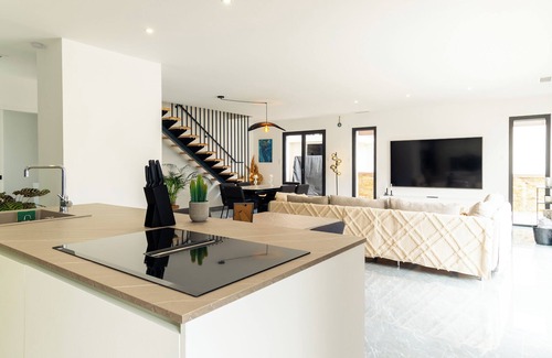a modern, fully equipped kitchen with oven, microwave, induction hob, fridge, freezer, dishwasher, extractor fan, toaster, nespresso capsule coffee maker, kettle, wine cellar, electric griddle, cooking utensils, crockery, condiments