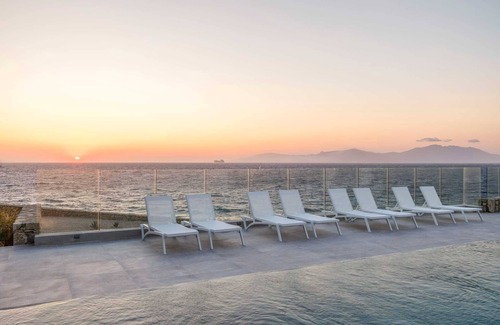 minutes away from the vibrant town of mykonos, this beachfront villa is a