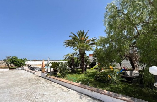an enchanting outdoor area with a large swimming pool equipped with a gazebo and deck chairs; well-kept garden with typical mediterranean plants, lawns and flowers of various species and a well-equipped courtyard with barbecue and wood-burning oven to bake hot bread, pizzas and desserts at any time or try to try your hand at salento specialties such as pucce and frize salentine