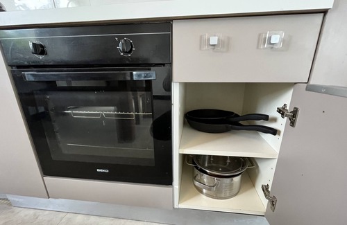 la cuisine est équipée d'une plaque de cuisson, d'un four, d'un réfrigérateur, d'un congélateur, d'un four à micro-ondes, d'un lave-vaisselle, d'une cafetière, d'un grille pain et d'une bouilloire