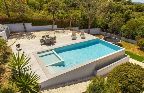 outdoors, a swimming pool overlooking the countryside invites you to soak up the algarve sun The garden features fruit trees, a comfortable lounge area by the pool, a trampoline for children’s fun, and a barbecue for enjoying meals outdoors with family or friends.
