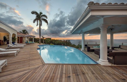 entering the villa, the stunning panoramic views dazzle with a brilliant sweep of tropical green mountains and endless blue sea and sky Anguilla is on the horizon. Just below the deck, you see waves crashing on the beach. Surrounding the villa are colorful gardens filled with tropical flowers as well as papaya and banana trees. The blue endless heated pool connects the amazing view to the villa. The spacious horseshoe shaped epi wood terrace is filled with outdoor dining and seating to enjoy the view and wonderful breezes. Little seating niches and a large covered gazebo offer quiet places to relax.