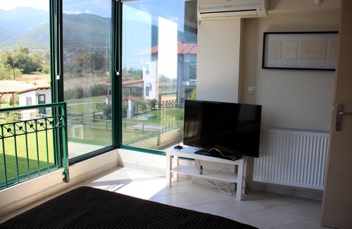 The comfortable Villa Iliana with a private pool is located in an exclusive residential area, close to the picturesque village Skotina in the foothills of the Mount Olympus. It is a well maintained property in a green, quiet area that provides many options for excursions or hiking tours. The house is surrounded by a large garden with lawn and various Mediterranean plants and flowers. Two wonderful roofed terraces with garden furniture provide the necessary shade according to the time of day, 2 outdoor fans provide cooling on some hot days. The portable patio fireplace provides warmth and makes for unforgettable holiday evenings. The sun loungers by the pool invite you to relax and chill.
