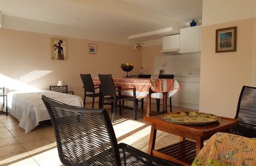 lower floor of 30 m2 includes a large room (air-conditioned in 2018) with two single beds of 90 cm, a sofa bed, a kitchenette and a bathroom with toilet