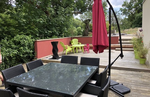 ground floor: living room, kitchen, living room and toilet the living room opens onto a large wooden terrace with a dining set for 8 people, a barbecue, a brazier and a fountain