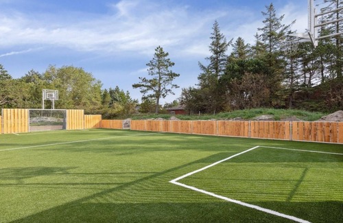 This luxurious holiday home on the picturesque island of Rømø comfortably accommodates up to 16 guests. The property features two separate sleeping areas, a large activity room, a pool area, and a variety of outdoor activities, making it perfect for large groups or families. The activity room is equipped for table tennis, billiards, and darts, and also includes a PlayStation and reading area. The pool area offers a refreshing swim and a counter-current system for fitness enthusiasts. The property also boasts an outdoor wellness area with a whirlpool and sauna on the terrace. The well-equipped kitchen and large dining area are perfect for meal times, with an outdoor barbecue and dining area also available. The property includes two sleeping quarters with three bedrooms and a bathroom each, plus a loft that can sleep up to four guests. Guests also have access to a large communal outdoor play area and multi-purpose court for various sports. The holiday home is conveniently located just 350 meters from the water on the eastern side of Rømø and 4 km from Lakolk Strand on the west coast..