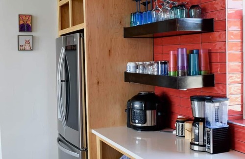inside, the home features three comfortable bedrooms, each with a queen bed, plus a cozy sofa bed in the front entry—allowing the home to sleep up to 7 guests in total The well-stocked kitchen comes equipped with top-of-the-line appliances, including a wine fridge, and the living space includes a 50” TV with premium sound for cozy movie nights.