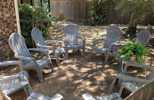 the wonderfully shaded backyard is a perfect place for outdoor cookouts the backyard has a large circle of chairs for gathering!