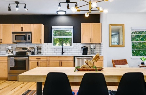 aside from the amazing location, the 3 bedroom/ 2 bathroom eclectic home offers a great place to relax with everything you need the private backyard offers a fire pit, loungers, cornhole game (a texas favorite!), and an outdoor eating area! coming back inside, there are multiple areas to spread out with tvs in each room and open space in the main living to all gather together! the kitchen is fully equipped with: