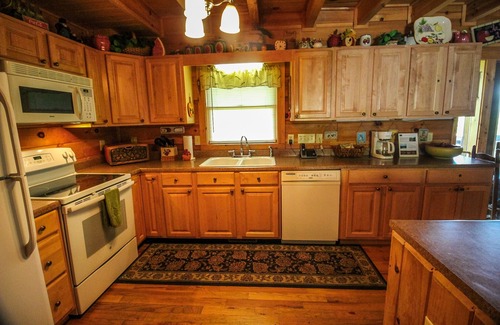 west jefferson, nc - want to be assured of a restful vacation? this log cabin, privately situated only three miles from west jefferson, is just the place to stay Whether you're looking for a quiet romantic weekend, or a week-long family vacation, you'll enjoy the comfort and modern amenities of this log home. There are wonderful mountain views to enjoy from the rocking chairs on the oversized porch or the bubbling hot tub. Inside, in air-conditioned comfort, the main level offers a large great room with plush furniture, a cozy gas fireplace, 42 Plasma HDTV with premium satellite channels including Starz and movie channels, a dining and kitchen area with lots of windows for enjoying those wonderful mountain views, along with a nice-sized bedroom with king bed and hall bath. Hardwood floors lead up to the loft area, nicely furnished as a sitting/sleeping area and shelves stocked with many bestseller books. The huge master bedroom provides a comfy king bed, satellite TV & its own private bath and walk-in closet. Have additional guests or children? The downstairs area provides another bedroom with two sets of bunks and a daybed that makes two twins, along with a third full bath. Tired of eating out? Throw a steak on the charcoal grill and enjoy the evening nestling by the fire or rocking on the porch! Now that's relaxing. Or, if you prefer, make a quick trip into West Jefferson, and eat out at one of our fine restaurants, shop the downtown area with its quaint shops and art galleries, or spend about 25 minutes driving into Boone, Blowing Rock, or to the ski slopes. Well-behaved dogs are welcome, and a fenced area with Dog Run is provided. Sorry, no cats. Towels & Linens are provided along with a washer/dryer. Wireless DSL access and fax machine is now available, as well as Pool table, Pub table and chairs, and 2 additional TV's (total of 4) have just been added to increase your enjoyment of this cabin.