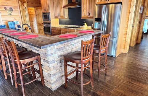 the main level features an open-concept living area with a cozy stone fireplace with gas logs, inviting you to relax while enjoying the panoramic views The fully equipped kitchen boasts stainless steel appliances, granite countertops, and a spacious island with seating for six, perfect for casual meals or morning coffee. A dining area with seating for eight provides the perfect setting for family dinners. The master suite on this level offers a luxurious king bed, large flat-screen TV, and an en-suite bathroom complete with a soaking tub and a step-in shower with a rain head. Step outside to expansive covered and uncovered decks, where you can take in the fresh mountain air and admire the picturesque surroundings.
