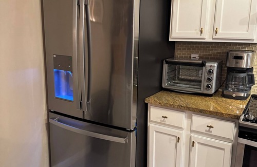 there is plenty of off-street parking, a private back yard with beautiful large fenced patio (for people & your pet!), grill, and an outdoor hot & cold shower There is A/C throughout.