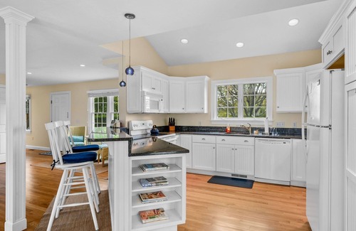 light, bright, and airy This open floor plan lends to easy living on the Cape! The first floor offers coastal comfort with plenty of comfy seating in the living area, a cozy gas fireplace, and flat screen TV above the mantel. WiFi throughout to keep you connected.