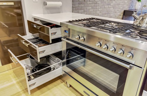 - a fully equipped european style kitchen, with custom berloni cabinets, quartz countertops, a 5-burner gas range, and a breakfast bar that seats 4