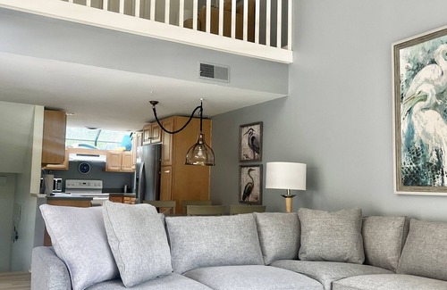 just a few steps get you into this 1400 square feet condo, the foyer brings guests to the main floor of this 2-story townhouse The open floor plan welcomes guests in for a warm, relaxing stay. Furnished with a new sectional sofa, the living room is filled with natural light from the large glass windowpanes leading to the deck. The dining area has seating for four at the table. The kitchen is fully equipped with everything needed for a family dinner.