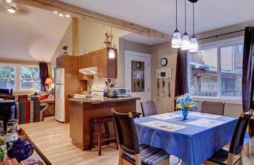 the mountain side bedroom offers bunk beds with double on the bottom and single on top, and features an on suite half bath The Kitchen has everything needed to prepare any meal. laundry? no problem, we have you covered there as well!