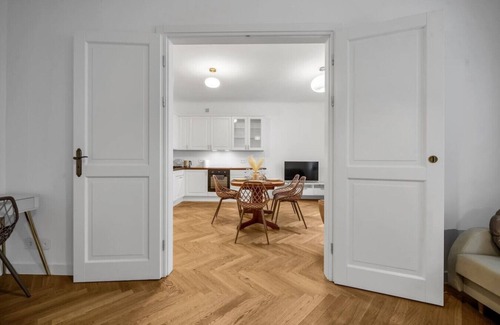 this spacious 82m² ground-floor apartment is perfect for up to five guests, offering comfort and convenience in an excellent location It features three rooms, including a cozy queen bed, a comfortable sofa bed, and two single beds, ensuring a restful stay for everyone. With two modern bathrooms, each equipped with a shower, there’s plenty of space for all guests. Situated within walking distance of the city center, the apartment is just 300 meters from the nearest metro station and the renowned Copernicus Science Center, making it an ideal base for exploring the city. The beautiful Vistula River Boulevards are only 1 km away, while the National Stadium is just 1.7 km from the property. Enjoy fast Wi-Fi and a Smart TV for entertainment, and take advantage of the fully equipped kitchen and bathroom for a hassle-free stay. We provide a complimentary set of toiletries, fresh towels, as well as coffee and tea to make you feel at home. Self check-in and check-out ensure maximum flexibility, and VAT invoices can be issued upon request. Whether you're visiting for business or leisure, this apartment offers everything you need for a comfortable and enjoyable stay. feel free to reach out if you have any questions or would like to book your stay!