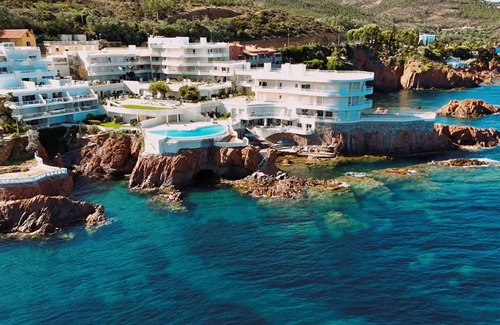 located between agay and théoule, "once upon a time" le navire hôtel.. Mythical hotel from 1930 whose shape of an ocean liner sinking into the sea has caused a lot of ink to flow. Its location was exceptional, wedged between sea and mountains, the bow in the azure water of the Cap Roux National Reserve, the body clinging to the red rocks of the Natura 2000 protected park of Esterel, on the most beautiful road in the Var, the golden cornice. Time and a later restructuring, the domain of Cap Nérée was born, partly resuming the original form.